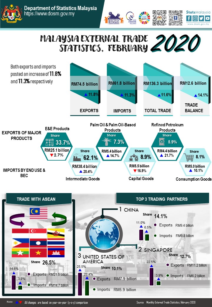 Total trade which was valued at RM136.3 billion increased RM14.1 billion or 11.6% as compared to February 2019. However, it fell RM19.9 billion or 12.7% when compared to January 2020. The trade surplus was RM12.6 billion, increased RM1.6 billion (+14.1%) from a year ago. It was also increased by RM586.5 million (+4.9%) when compared to the previous month.