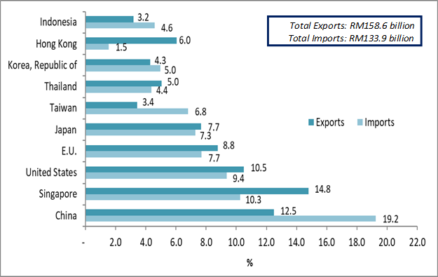 Imports from China amounted to RM9.8 billion, increased RM591.9 million (+6.5%) as compared to the previous year. The main product which attributed to the rise was E&E products (44.1% of total imports), increased RM953.5 million or 28.5% to RM4.3 billion. However, imports of refined petroleum products decreased RM453.7 million or 29.0% to RM1.1 billion.
