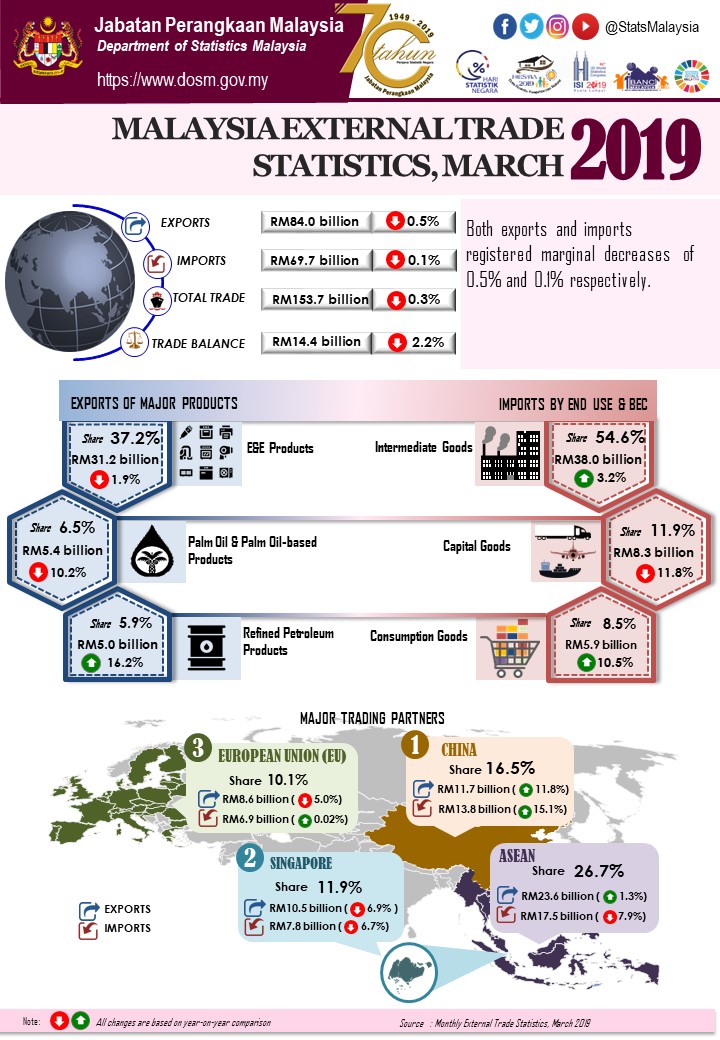 Total trade which was valued at RM153.7 billion decreased RM518.6 million or 0.3% in March 2019. However, it grew RM31.6 billion or 25.9% when compared to February 2019. The trade surplus was RM14.4 billion, shrank RM318.5 million (-2.2%) from a year ago. However, it surged 30.0% or RM3.3 billion as compared to the previous month.