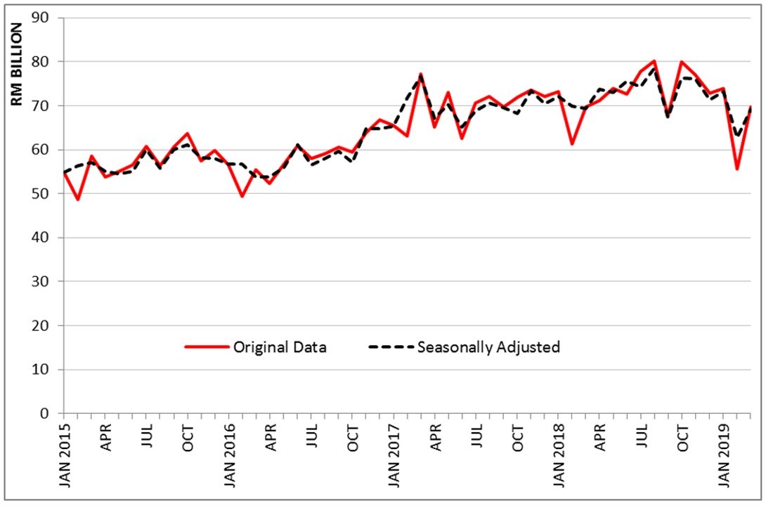 On a m-o-m basis seasonally adjusted terms, imports increased RM6.6 billion (+10.5%) to RM69.2 billion.