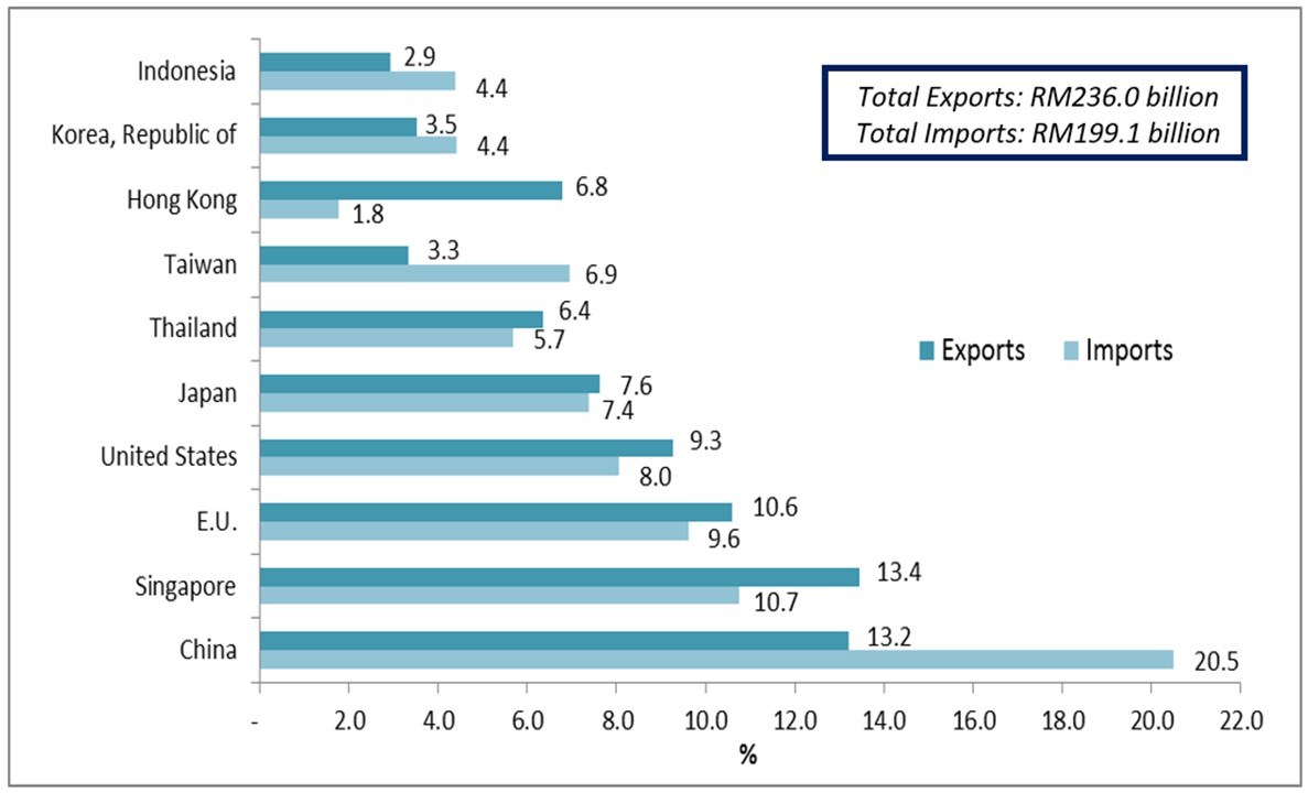 • On a y-o-y basis,  the  decrease  in  exports  was  attributed  to  lower  exports  to  Hong Kong  (-RM1.9 billion),  Indonesia (-RM1.3 billion), Japan (-RM1.3 billion), Switzerland (-RM1.0 billion) and Turkey (-RM539.3 million).  However, exports increased to China (+RM2.0 billion), Taiwan (+RM1.5 billion) and Thailand (+RM1.4 billion).