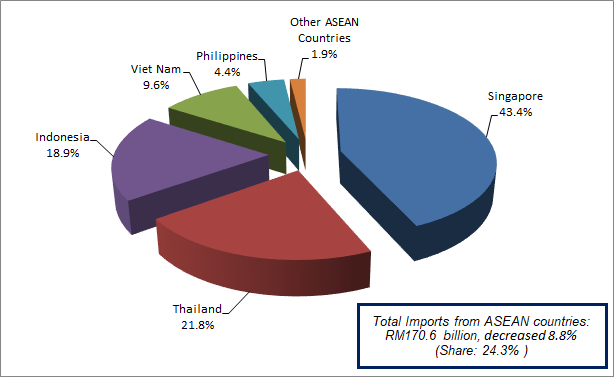 Imports from Singapore declined RM1.1 billion (-10.9%) to RM9.1 billion from a year ago. The main product which attributed to the decrease was refined petroleum products (33.3% of total imports), decreased RM1.2 billion or 29.0% to RM3.0 billion. However, the imports of E&E products (35.7% of total imports), increased RM360.2 million or 12.5% to RM3.2 billion.
