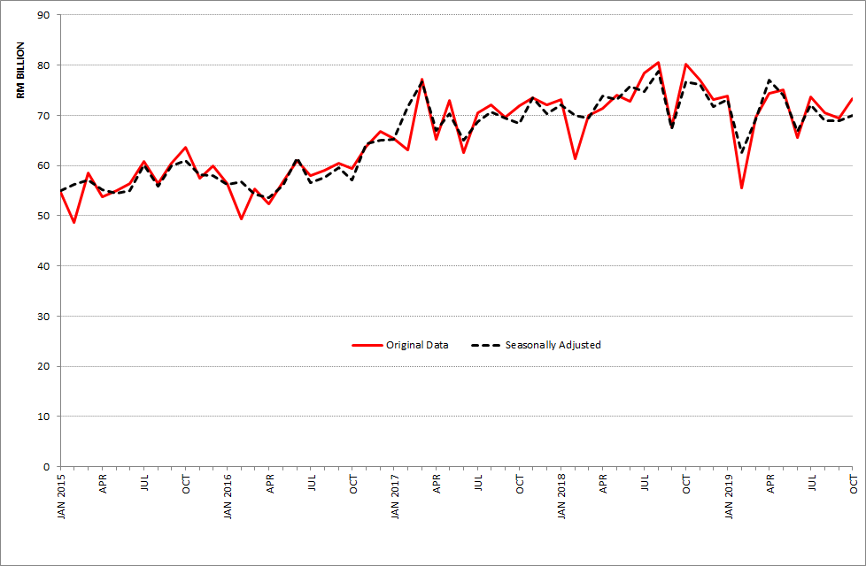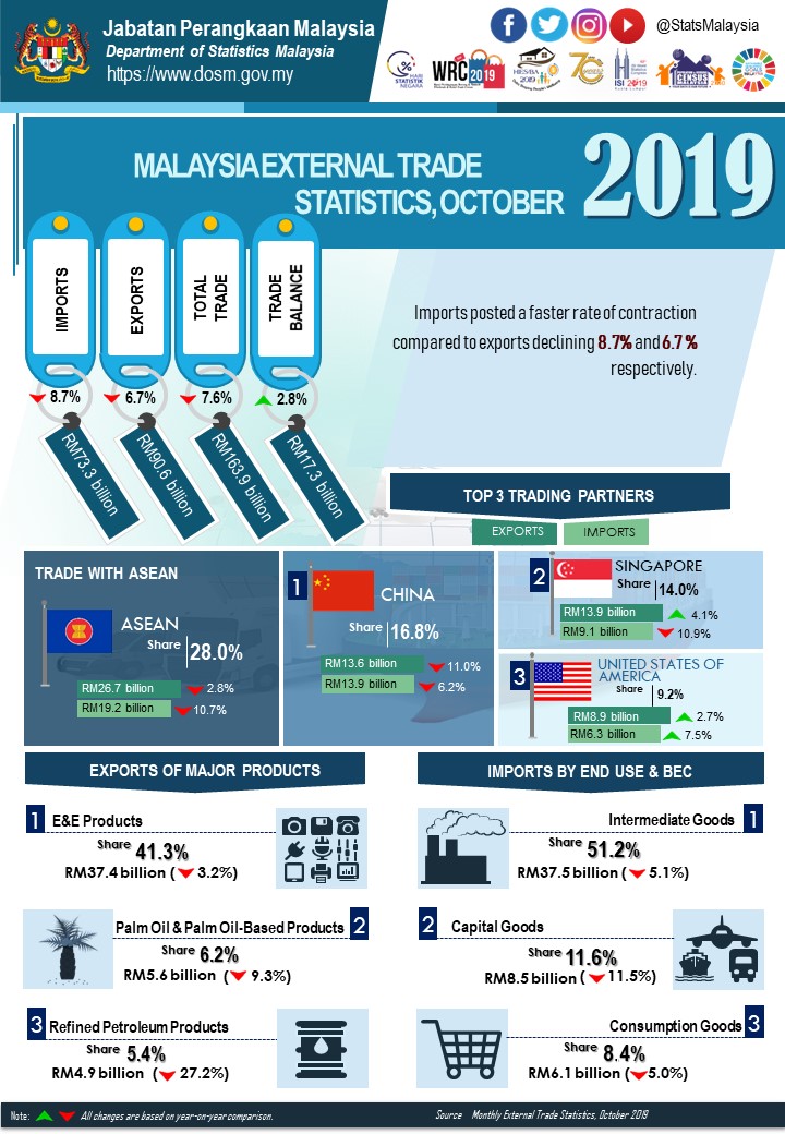 - Imports amounted to RM73.3 billion, a contraction of 8.7% from October 2018.