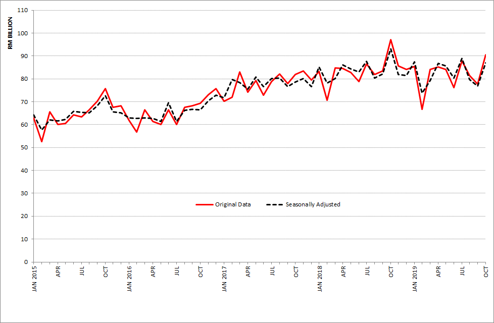 Total trade stood at RM163.9 billion, declining 7.6% or RM13.5 billion compared to October 2018. However, it rose 11.4% or RM16.8 billion when compared to the previous month. The trade surplus was valued at RM17.3 billion and recorded an increase of RM474.3 million (+2.8%) from a year ago. It also posted an increase of RM9.0 billion or 107.4% as compared to the previous month.