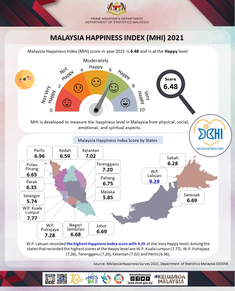 Malaysia (DOSM) to measure the level of happiness in Malaysia from the physical, social, emotional and spiritual aspects. The survey was implemented from September to November 2021 based on household approach covering selected residential areas in Malaysia. The main findings of this survey were displayed by state, strata, gender, ethnic group, age group, marital status and educational attainment