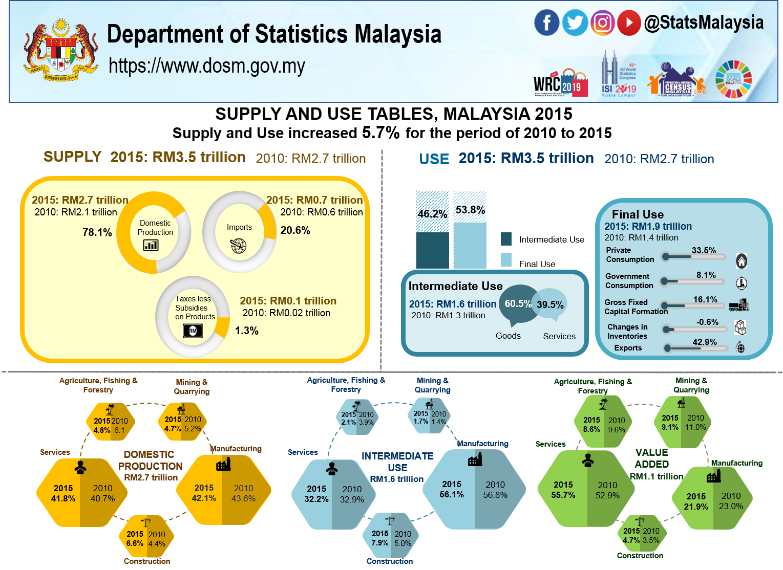 Total supply and use in the Malaysia’s economy was valued at RM3.5 trillion in 2015 as compared to RM2.7 trillion in 2010. It grew 5.7 per cent annually for the five years period.