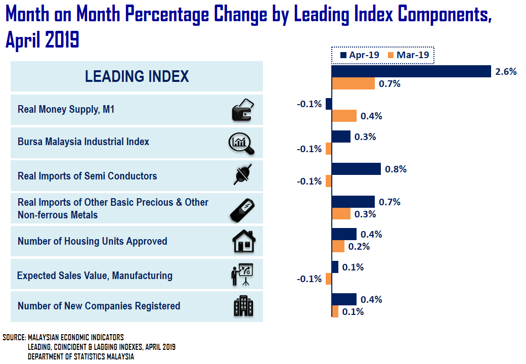 The Malaysia’s economic growth is expected to show a better performance in August to October 2019. This is supported by a stronger Leading Index (LI) which monitors the economic direction in advance. A 2.6 per cent surge in monthly change of LI to attain 120.0 points in April 2019 from 117.0 points in March 2019 was mainly underpinned by the increase in Real Imports of Semi Conductors (0.8%) and Real Imports of Other Basic Precious & Other Non-ferrous Metals (0.7%). At the same time, the annual change of LI improved further to 0.4 per cent in the reference month.