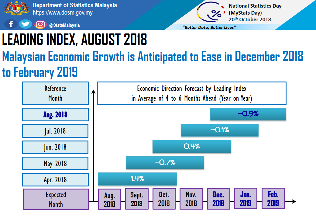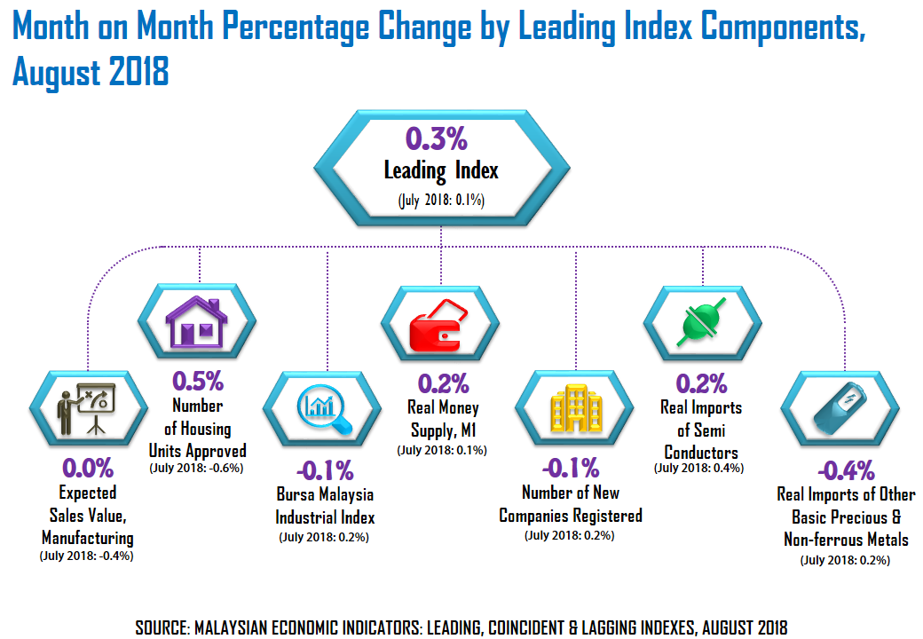 The Malaysian Economic Indicators: Leading, Coincident & Lagging Indexes for August 2018 expects the economic growth to ease in December 2018 to February 2019. The annual change of Leading Index (LI) decreased 0.9 per cent in the reference month. The LI is compiled to provide a signal where the economy is heading for an average of four to six months ahead. On the opposite side, the monthly change of LI posted an increase of 0.3 per cent in August 2018 to 118.9 points, following 0.1 per cent increase in July 2018. Three components of LI that attributed to the increase were Number of Housing Units Approved (0.5%), Real Money Supply, M1 (0.2%) and Real Imports of Semi Conductors (0.2%).