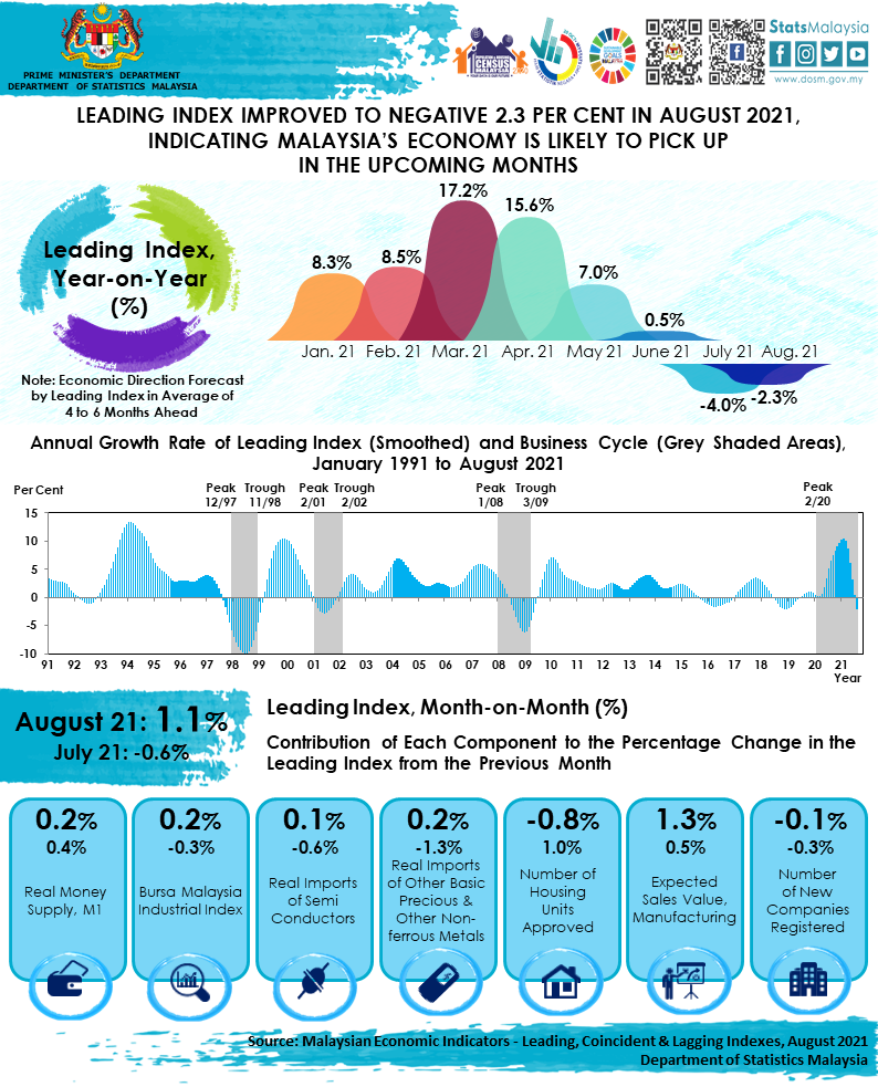 Leading Index improved to negative 2.3 per cent in August 2021, indicating Malaysia’s economy is likely to pick up in the upcoming months