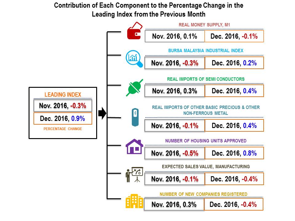 The Leading Index (LI) which monitors the economic performance in advance augmented in December 2016. The LI posted a growth of 0.9% to 117.4 points in the current month from 116.4 points in November 2016. This was supported mainly by Number of Housing Units Approved (0.8%), Real Imports of Semi Conductors (0.4%) and Real Imports of Other Basic Precious & Other Non-ferrous Metal (0.4%). The annual change of LI showed an improvement from negative 1.4% in the previous month to negative 0.5% in December 2016.