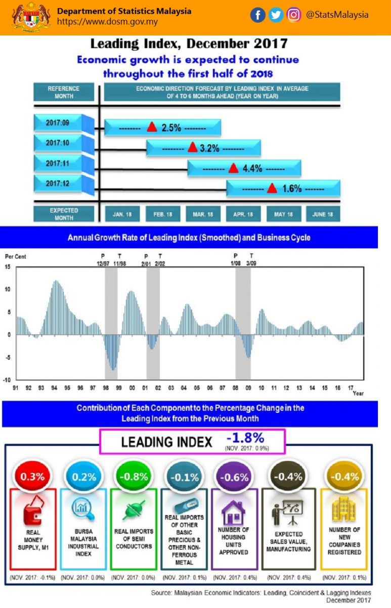 The annual change of LI and CI in December 2017 remained favourable at a slower momentum as compared to the previous month. Supported by the level of both Diffusion Indexes sustaining above 50.0%, it is expected that the economic growth will continue throughout the first half of 2018.