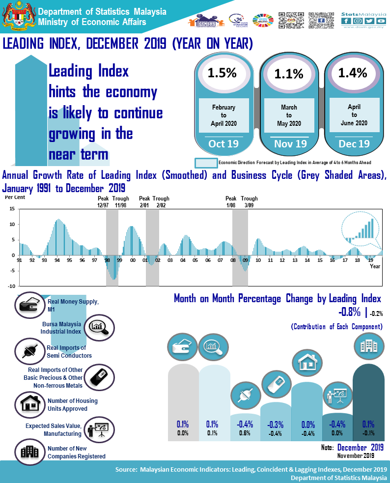 The Leading Index (LI) is one of the tools to provide information about the future direction of an economy which registered an annual growth of 1.4 per cent in December 2019. Meanwhile, the LI monthly growth rate contracted 0.8 per cent in the last month of 2019. This was mainly affected by the decreased in Real Imports of Semi Conductors (-0.4%) and Expected Sales Value in Manufacturing sector (-0.4%). Concurrently, the growth rate of LI (smoothed) remains favourable above trend which implies that the economic growth is likely to continue in the near term without considering the internal and external shock to the economy.