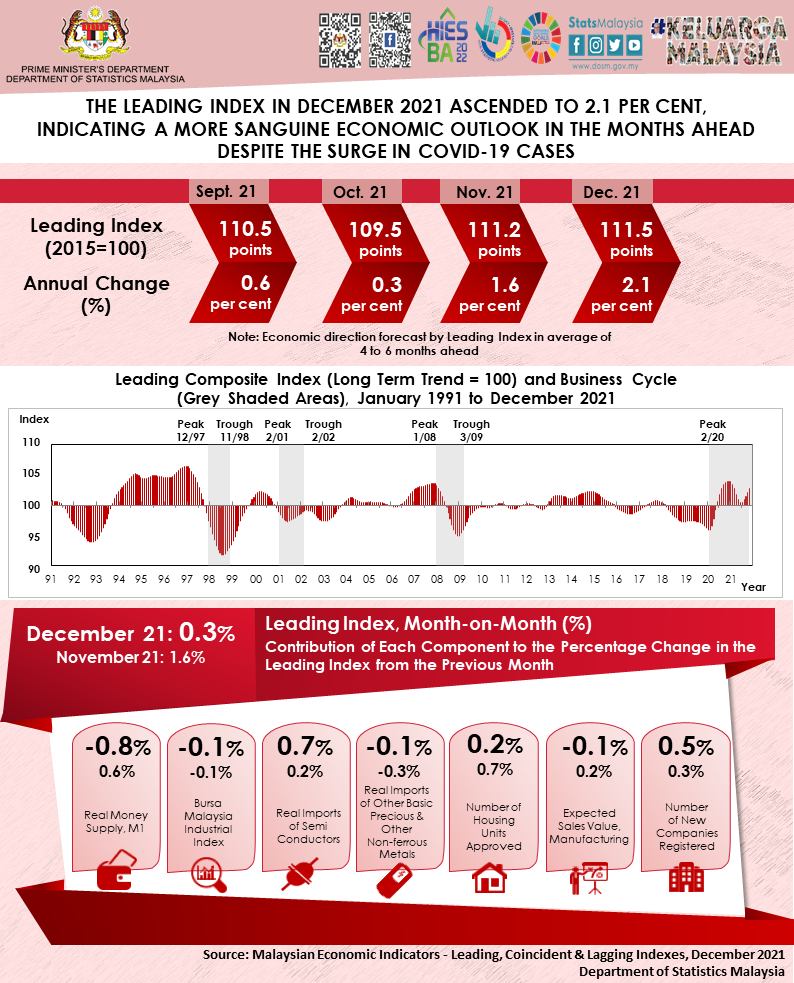 Malaysia’s Leading Index (LI) in December 2021 remained in an upward growth trend at 2.1 per cent, reaching 111.5 points over the same month of the previous year (December 2020: 109.2 points). The growth primarily supported by a sturdy gain in the Number of Housing Units Approved. In comparison to the previous month, the LI eased to 0.3 per cent in December 2021 (November 2021: 1.6%). The increase was highly contributed by Real Imports of Semi Conductors (0.7%) and Number of New Companies Registered (0.5%). The LI in December 2021 which continuously above 100.0 points and rising indicates a more sanguine momentum on the economic outlook in the months ahead. Despite the surge of COVID-19 cases, Malaysia optimises its healthcare resources to curb the spread of Omicron variant, rather than reimplementation of economic or social sanctions. Consequently, allows businesses to regain its momentum to spur economic recovery.