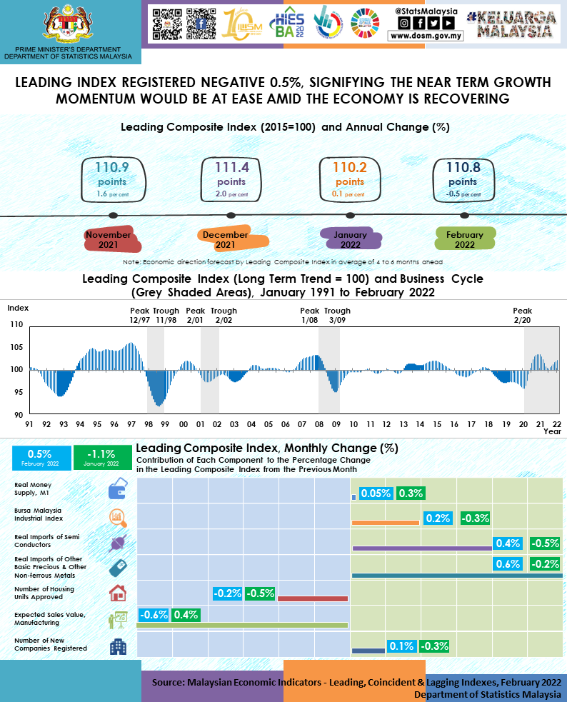 The full publication of the Malaysian Economic Indicators: Leading, Coincident & Lagging Indexes, February 2022 can be downloaded through eStatistik Portal.