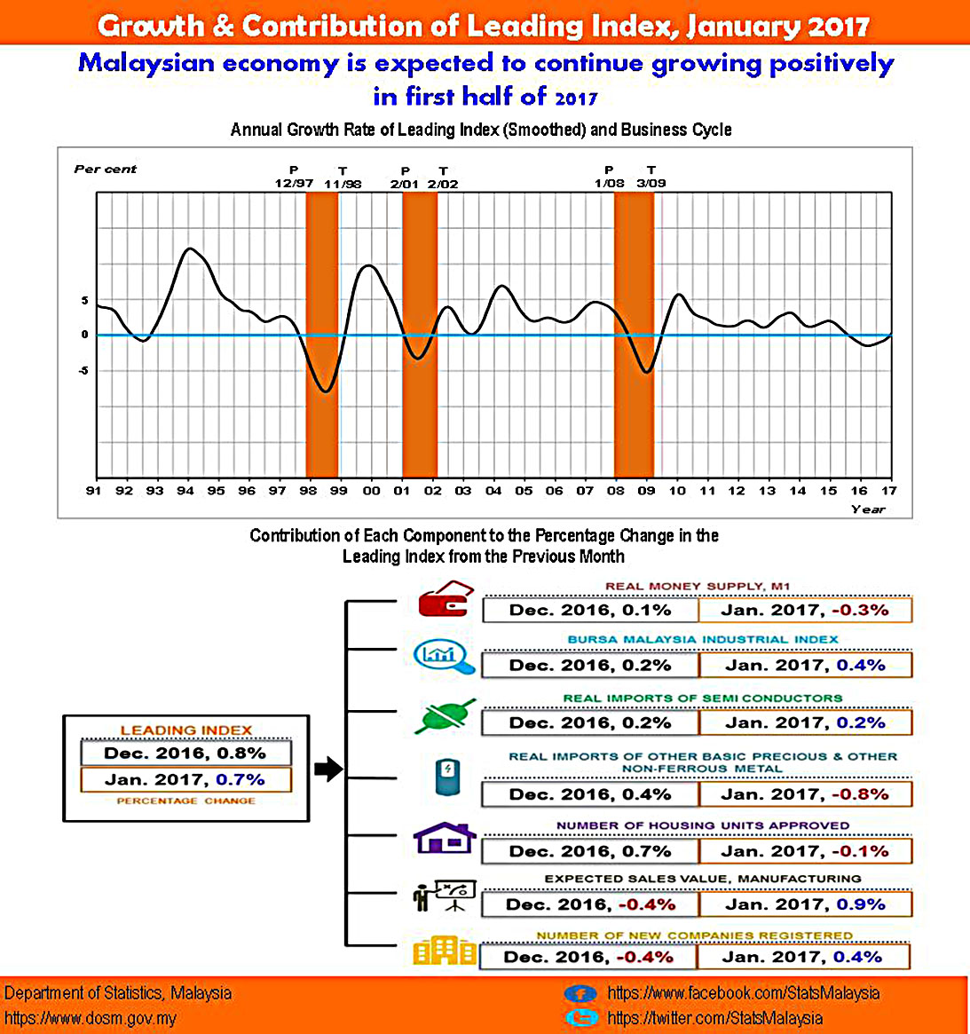 The Leading Index (LI) which monitors the economic performance in advance registered a growth of 0.7% to 117.8 points in January 2017 from 117.0 points in the previous month. The increase was underpinned by Expected Sales Value in Manufacturing Sector (0.9%), Bursa Malaysia Industrial Index (0.4%), Number of New Companies Registered (0.4%) and Real Imports of Semi Conductors (0.2%). The annual change of LI improved further to 0.2% in the reference month.