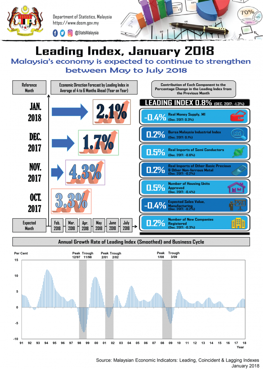 The LI and CI showed a good performance in January 2018 as compared to the preceding month. At the same time, both Diffusion Indexes remained above 50.0%. Thus, the Malaysia’s economy is expected to continue to strengthen between May to July 2018.