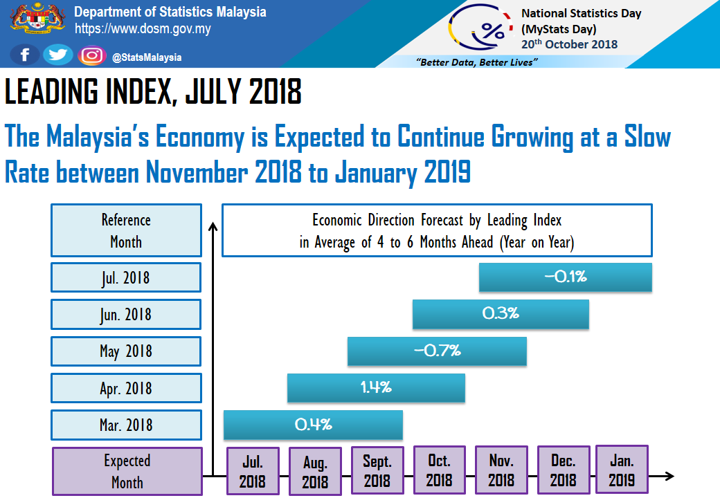The Malaysia’s economy is expected to continue growing at a slow rate between November 2018 to January 2019 according to the performance of Malaysian Economic Indicators: Leading, Coincident & Lagging Indexes for July 2018. The monthly change of Leading Index (LI) increased 0.2 per cent in July 2018. The LI was recorded at 118.6 points in the reference month as compared to 118.4 points in June 2018. Five out of seven components of LI make up the increased with the highest contribution by Real Imports of Semi Conductors (0.5%). In contrast, the annual change of LI decreased slightly, negative 0.1 per cent in July 2018. The LI is designed to monitor the economic performance for an average of four to six months ahead.