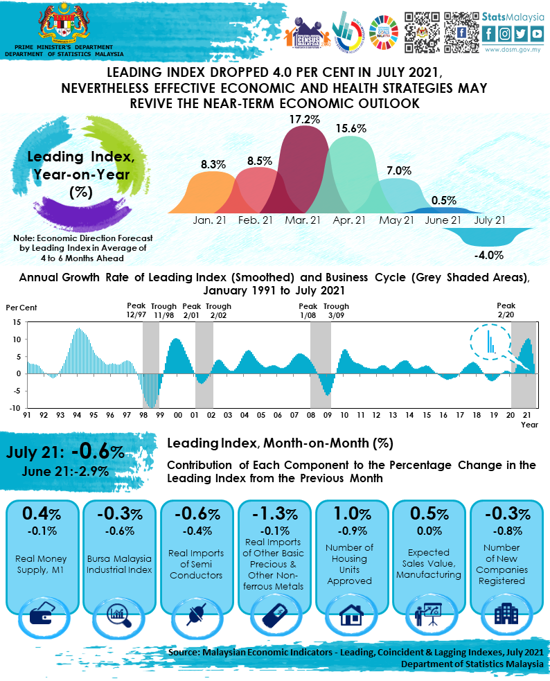 The full publication of the Malaysian Economic Indicators: Leading, Coincident & Lagging Indexes, July 2021 can be downloaded through eStatistik Portal.