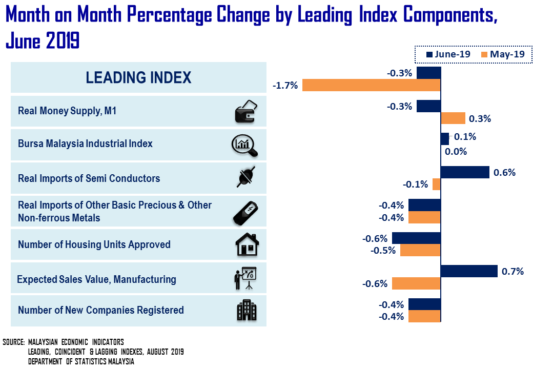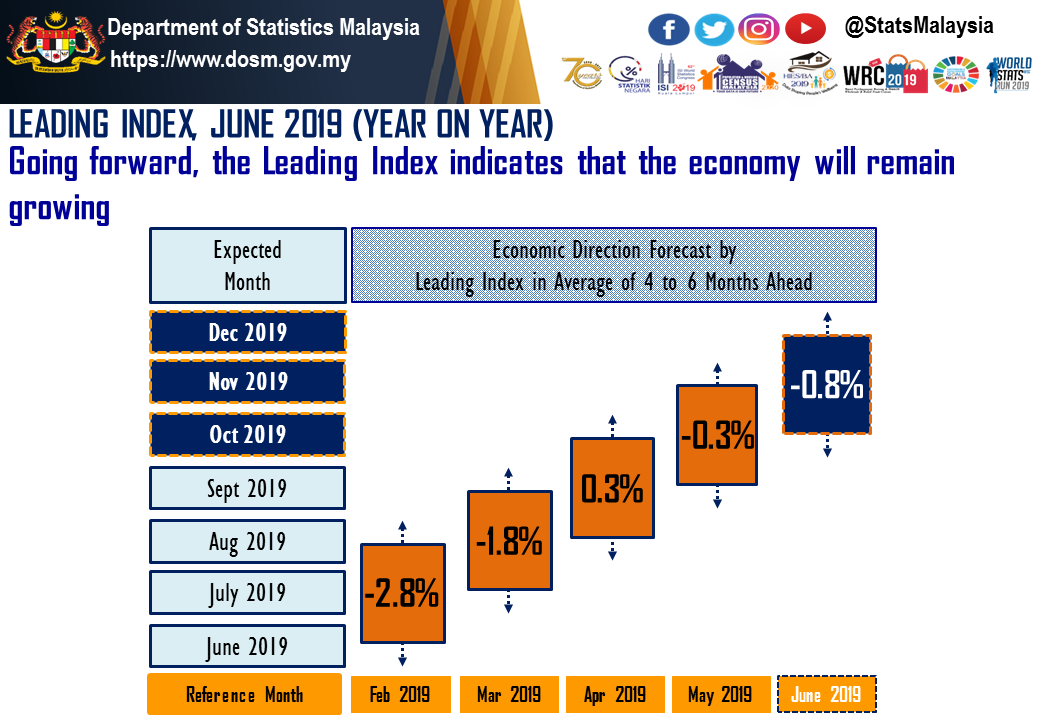 Malaysia’s Leading Index (LI) for June 2019 registered 117.6 points, down 0.3 per cent from a month earlier following negative 1.7 per cent in May 2019. The monthly growth remained negative due to the decrease in four of the LI components. On a yearly basis, the LI fell further for the second consecutive months to negative 0.8 per cent in June 2019 after having a positive growth of 0.3 per cent in April 2019. Thus, the LI indicates that the future economic direction will remain growing in October to December 2019.