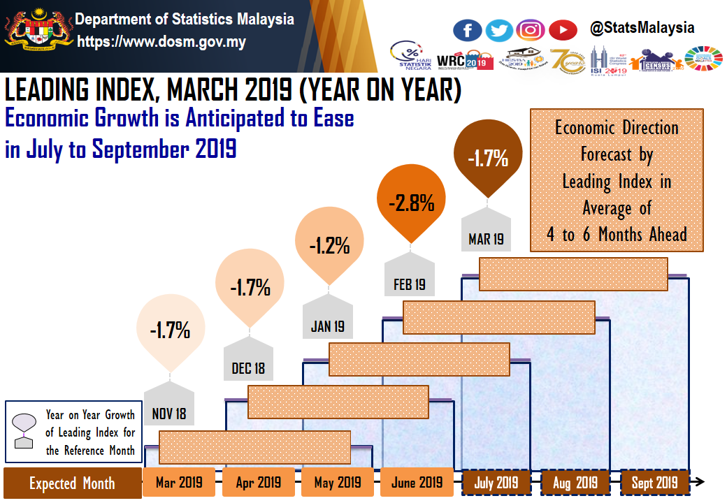 According to the Malaysian Economic Indicators: Leading, Coincident & Lagging Indexes for the reference month of March 2019, Malaysia’s economic growth is anticipated to ease in July to September 2019. The monthly change of Leading Index (LI) augmented in March 2019, posting a growth of 0.7 per cent to attain 117.1 points from 116.3 points in the previous month. This was primarily due to the increase of Real Money Supply, M1 (0.4%) and Real Imports of Other Basic Precious & Other Non-ferrous Metals (0.3%). The annual change of LI showed an improvement from negative 2.8 per cent in February 2019 to negative 1.7 per cent in March 2019. The composite of LI is designed to monitor the economic direction in an average of four to six months ahead.