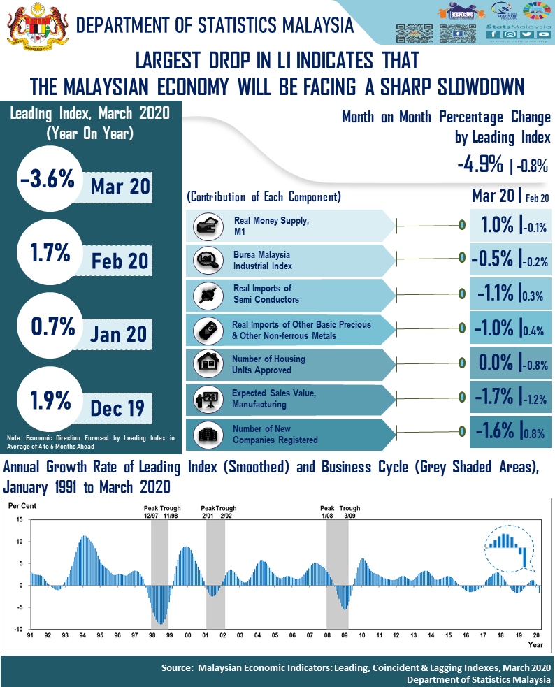 The Leading Index (LI) is compiled to anticipate the peak and trough (turning points) in the economic activity in the short term. The LI in March 2020 recorded the largest monthly drop since November 1991 following a 2-week movement restriction. The LI declined further to negative 4.9 per cent in March 2020 from negative 0.8 per cent in the previous month. The decreased were mainly attributed by Expected Sales Value in Manufacturing sector (-1.7%) and Number of New Companies Registered (-1.6%) which significantly caused the deterioration. Concurrently, the annual change of LI recorded negative 3.6 per cent in March 2020 as against 1.7 per cent in February 2020. The sharp drop in the LI reflects the shutting down in non-essential business activities following the unprecedented restrictions to curb the global pandemic. Thus, it is expected that the Malaysian economy will be facing a sharp slowdown in the near future.