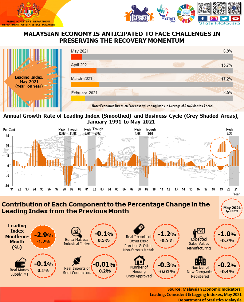 The full publication of the Malaysian Economic Indicators: Leading, Coincident & Lagging Indexes, May 2021 can be downloaded through eStatistik Portal.