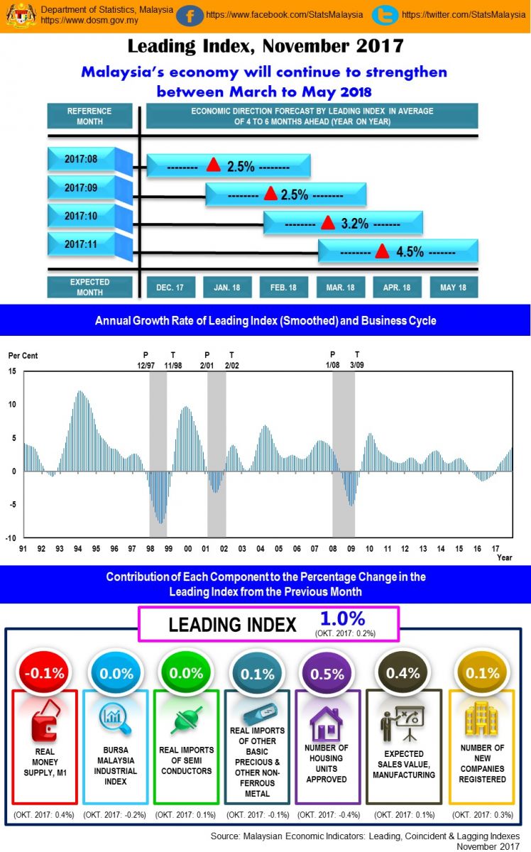 The Leading Index (LI) which monitors the economic performance in advance registered a growth of 1.0% in November 2017 to 121.3 points from 120.1 points in October 2017. The increased was underpinned by Number of Housing Units Approved (0.5%), Expected Sales Value in Manufacturing sector (0.4%), Real Imports of Other Basic Precious & Other Non-ferrous Metal (0.1%) and Number of New Companies Registered (0.1%). The annual change of LI picked up to 4.5% as compared 3.2% in the last month.
