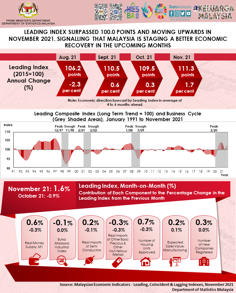 Leading Index surpassed 100.0 points and moving upwards in November 2021, signalling that Malaysia is staging a better economic recovery in the upcoming months