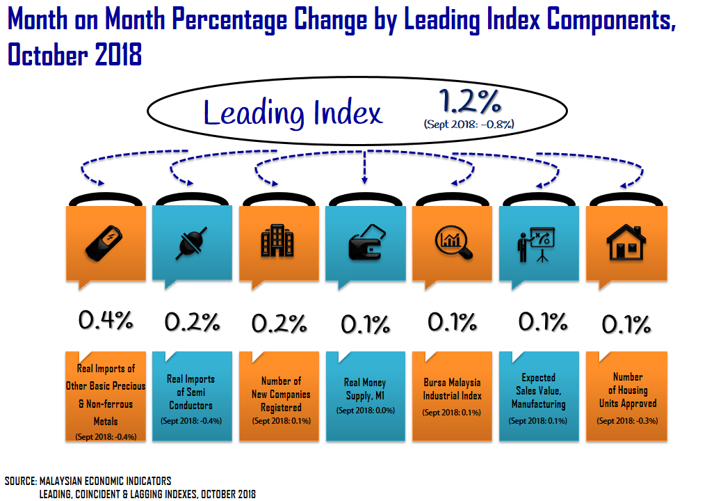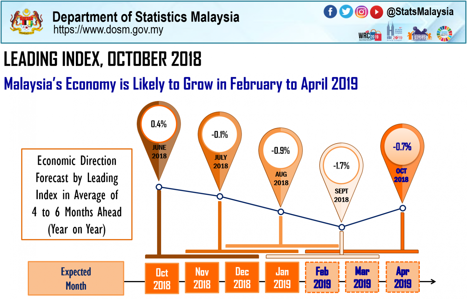 According to the performance of Malaysian Economic Indicators: Leading, Coincident & Lagging Indexes for October 2018, the Malaysia’s economy is likely to grow in February to April 2019. The monthly change of Leading Index (LI) augmented in October 2018, registering a growth of 1.2 per cent to attain 119.3 points from 117.9 points in the previous month. This was primarily due to the increase of Real Imports of Other Basic Precious & Other Non-ferrous Metals (0.4%). The annual change of LI showed an improvement from negative 1.7 per cent in September 2018 to negative 0.7 per cent in October 2018. The composite of LI is designed to monitor the economic performance direction in an average of four to six months ahead.