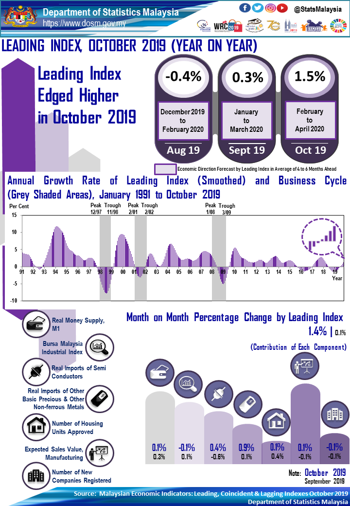 The Coincident Index (CI) which measures the current economic performance, surged 0.9 per cent in the reference month as compared to negative 1.2 per cent in September 2019 (October 2019: 139.3 points; September 2019: 138.0 points). The 1.3 points increased was driven by Capacity Utilisation in Manufacturing sector and Volume Index of Retail Trade which posted 0.4 per cent, respectively. Concurrently, the annual change of CI remained at 1.6 per cent.