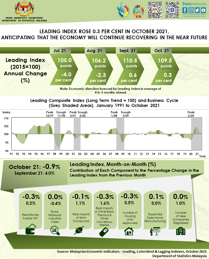 The annual Leading Index (LI) posted an increase of 0.3 per cent to attain 109.5 points in October 2021 after registering 0.6 per cent in September 2021. Real Imports of Semi Conductors remained as the major contributor to the increase in LI with positive demand for electronic integrated circuits. In the meantime, LI contracted by 0.9 per cent in the reference month as against the previous month. Real Money Supply, M1, followed by Real Imports of Other Basic Precious & Other Non-ferrous Metals and Number of Housing Units Approved attributed primarily to the decline of LI with each component recorded a negative 0.3 per cent. The performance of LI in October 2021 remained positive with the smoothed LI continued above the long-term trend and moving upwards. Based on the scenario, a more promising outlook is anticipated in the near term if gradual normalcy of economic activities persists. In addition, the progressive lift of the restrictions in mitigating the economic impact, together with the resumption of inter-state travelling brought positive vibes to the economy in regaining its growth momentum.