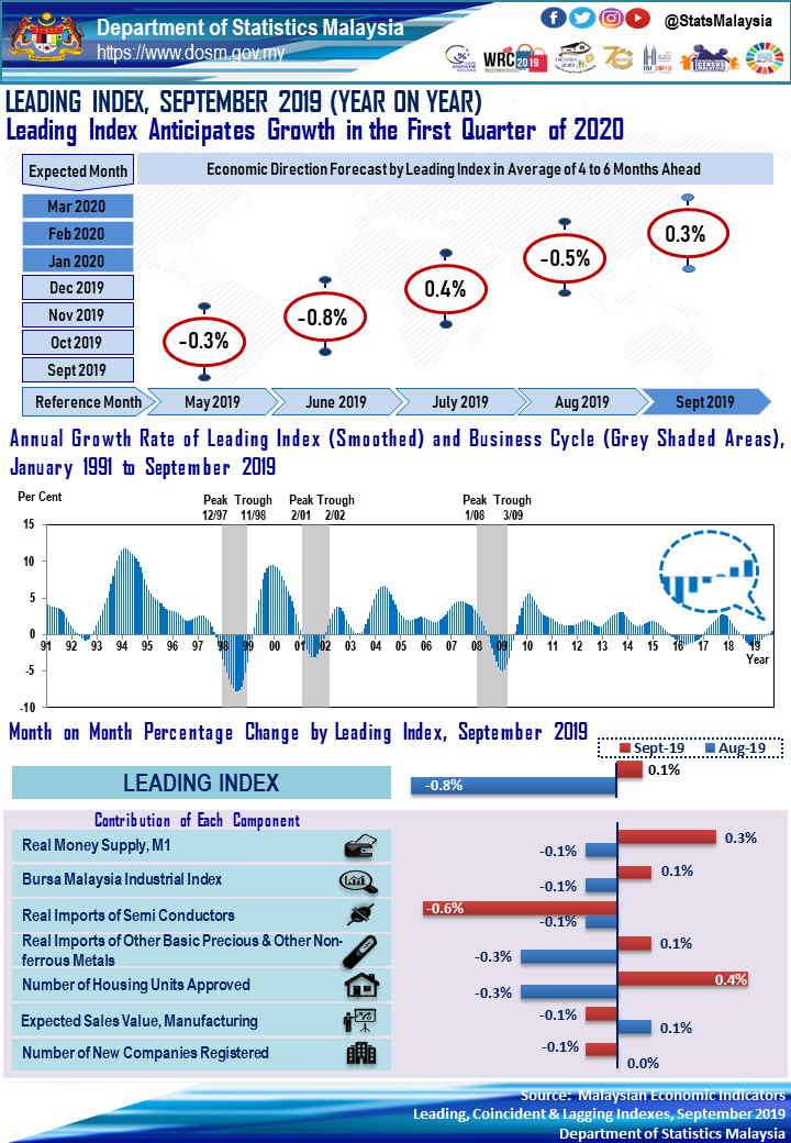 The Leading Index (LI) which indicates the likely direction of economic activity in average of four to six months into the future, increased 0.1 per cent in September 2019 from negative 0.8 per cent in August 2019. The components that significantly contributed to the growth were Number of Housing Units Approved (0.4%) and Real Money Supply, M1 (0.3%). This is in line with the annual change of LI which rebounded to positive growth by registering 0.3 per cent in the reference month as against negative 0.5 per cent in the previous month. The signal of LI is consistent with the growth rate of smoothed LI which continued moving upwards, showing that the growth momentum of the economy remains favourable in January to March 2020.