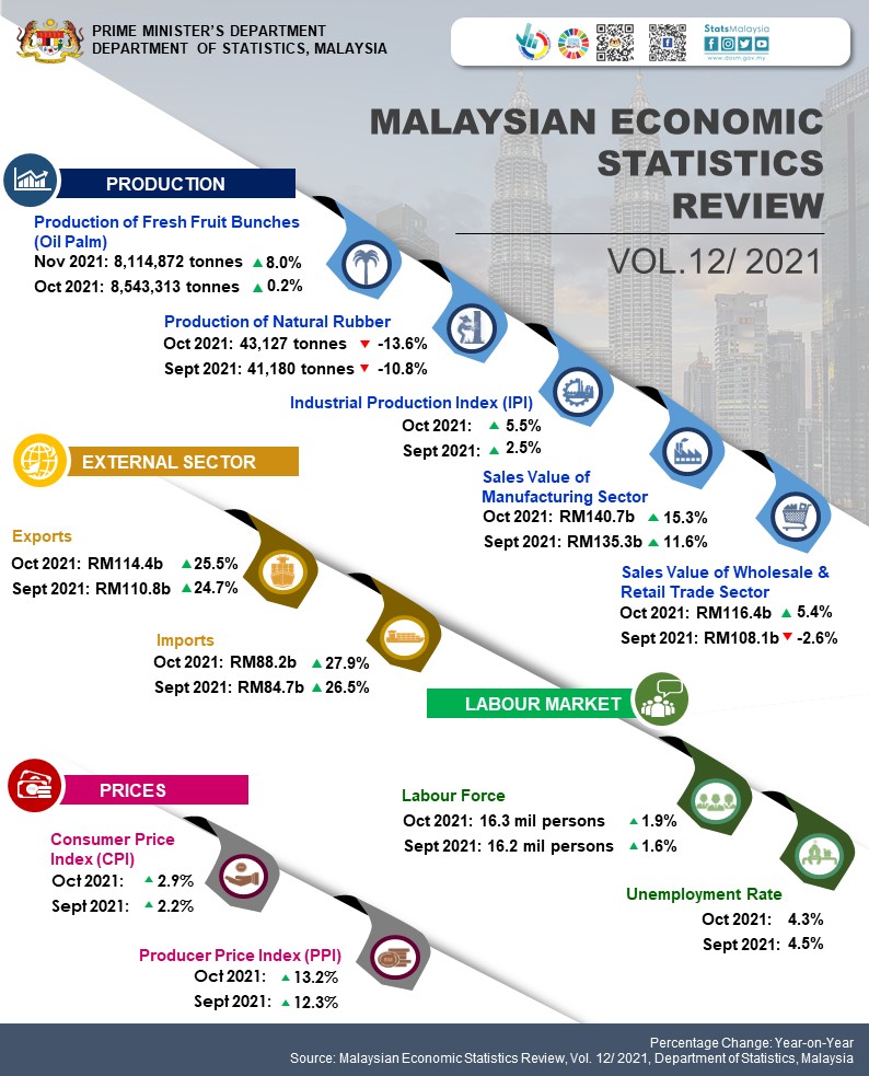 Malaysian Economic Statistics Review (MESR) Volume 12/2021 focuses on the economic scenario for October 2021, with some highlights on the upcoming statistics for November 2021. This release is also complemented with a box article entitled “Understanding Malaysian Outward FATS: The Performance of Malaysian Affiliate Abroad”, which provides insights on the performance of subsidiaries located outside of Malaysia as well as anticipating future turnover.