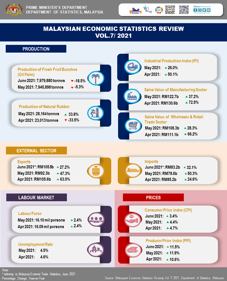 Malaysian Economic Statistics Review (MESR) Volume 7/2021 provides an in-depth analysis on the economic performance based on the recent statistics released by DOSM of which the focus is given to the economic scenario for May 2021 and highlights some forthcoming statistics for June 2021. This release is also complemented with a box article titled "Inflation in Urban and Rural: Why Differs?” which highlights the urban and rural inflation trends and gaps in Malaysia.