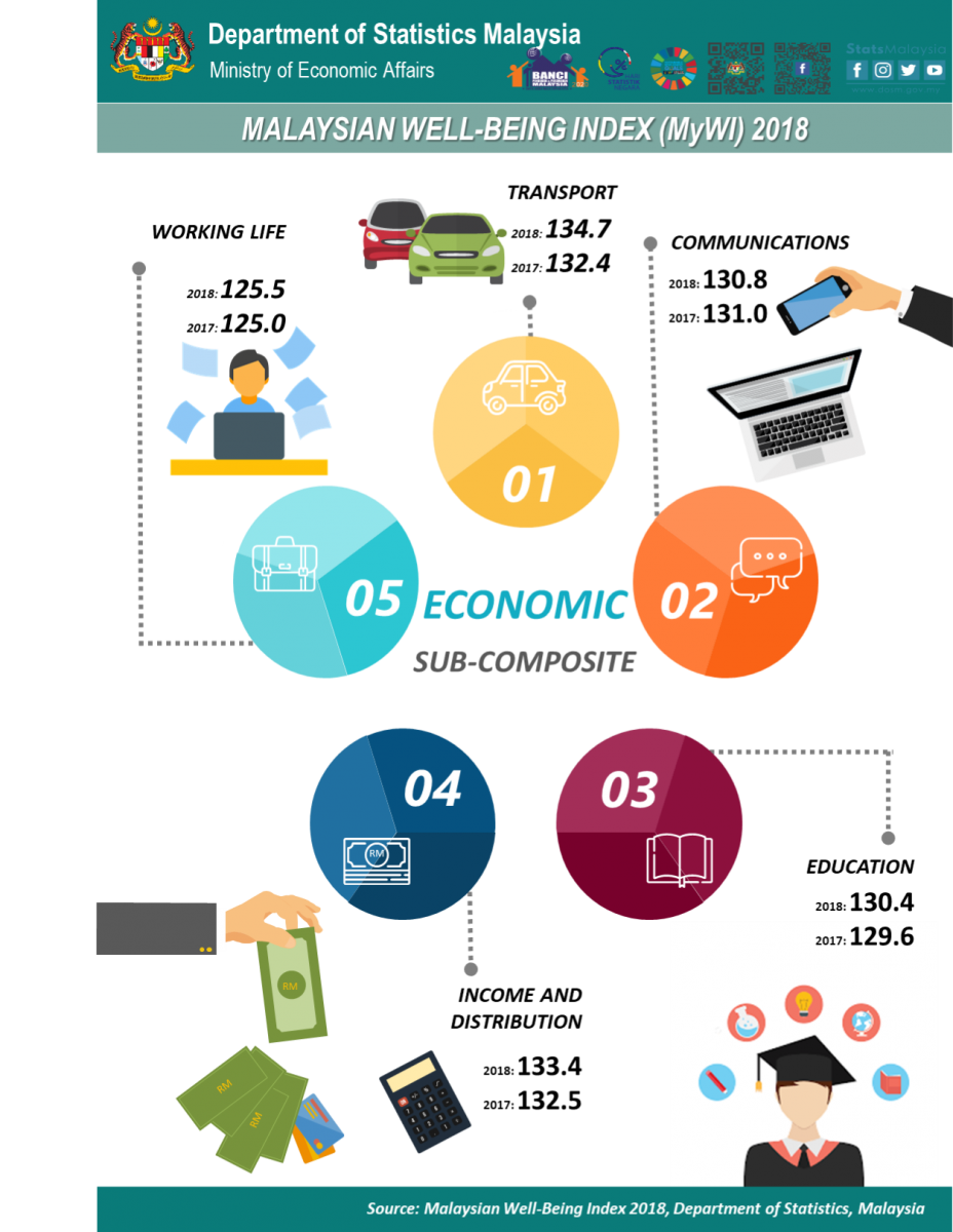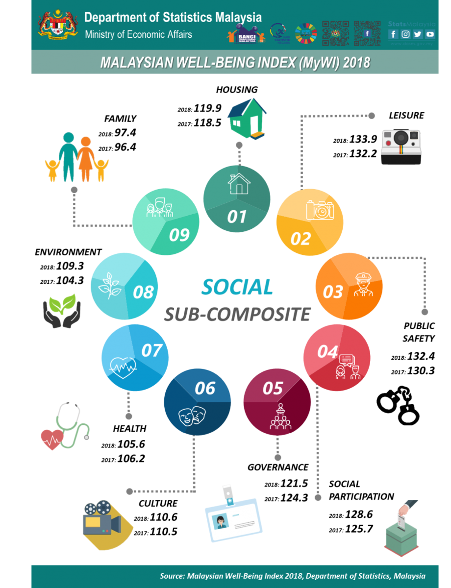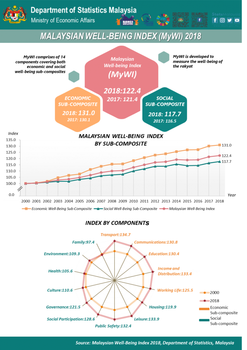 MyWI increased 0.8 per cent to 122.4 index points in 2018 as compared to 2017. The economic and social well-being sub-composites grew 0.7 per cent and 1.0 per cent respectively in 2018 as compared to the previous year.