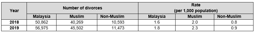 Table 2: Number of divorces and Crude Divorce Rate (CDR), Malaysia, 2018 and 2019