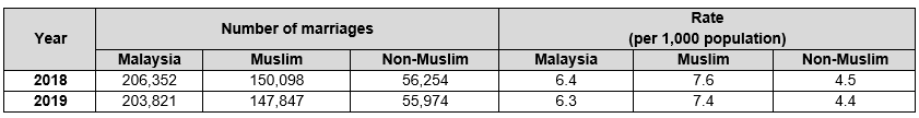 Table 1: Number of marriages and Crude Marriage Rate (CMR), Malaysia, 2018 and 2019