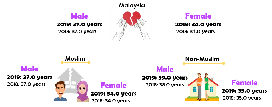 The median age at divorce for males and females remained at 37.0 and 34.0 years, respectively. Similar pattern was also observed for Muslim divorcees. Meanwhile, the median age for Non-Muslim male shifted from 38.0 years to 39.0 years.
