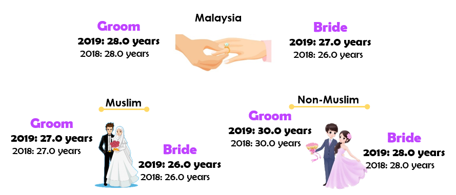 The median age of grooms remained at aged 28.0. Meanwhile, the median age for brides increased from 26.0 years to 27.0 years. The median age of grooms and brides for Muslim and Non-Muslim remained unchanged.