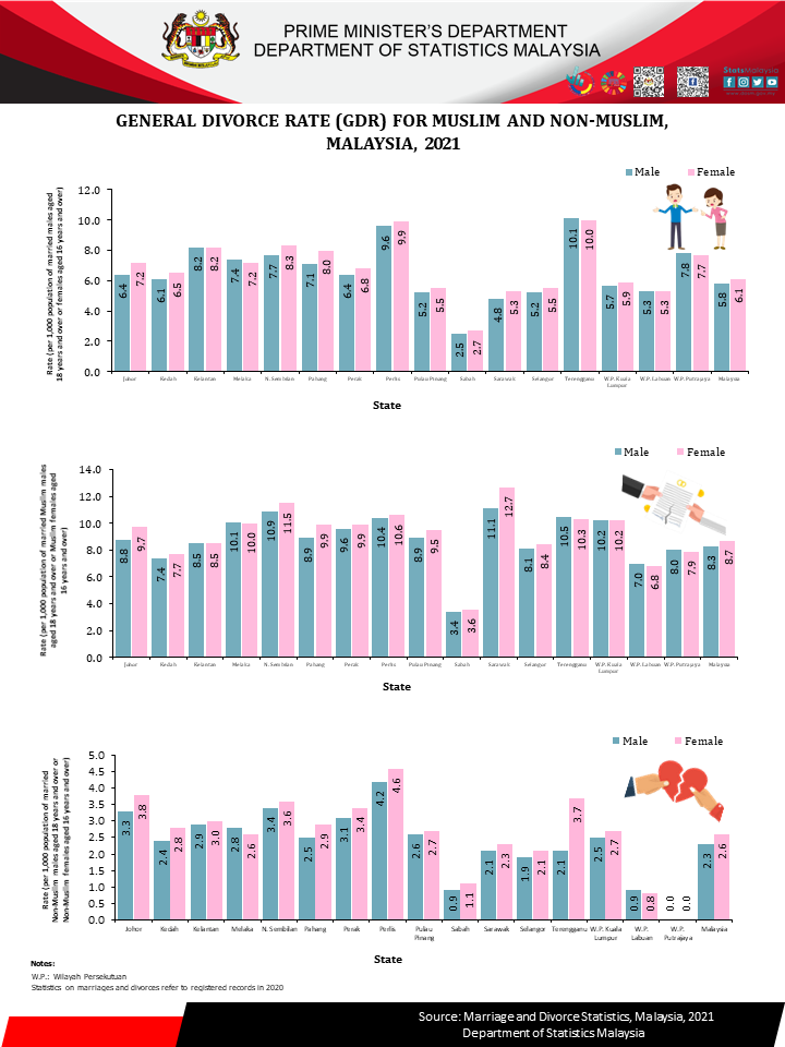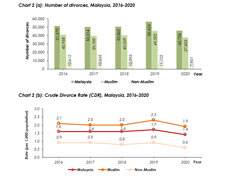 The number of Muslim divorces recorded in 2020 was 37,853, decreased 16.8 per cent as compared to 45,502 (2019). CDR decreased from 2.3 (2019) to 1.9 (2020) per thousand Muslim population. Similarly, Non-Muslim divorces decreased 29.0 per cent from 11,122 (2019) to 7,901 (2020). Therefore, CDR for Non-Muslim decreased from 0.9 (2019) to 0.6 (2020) per thousand Non-Muslim population.