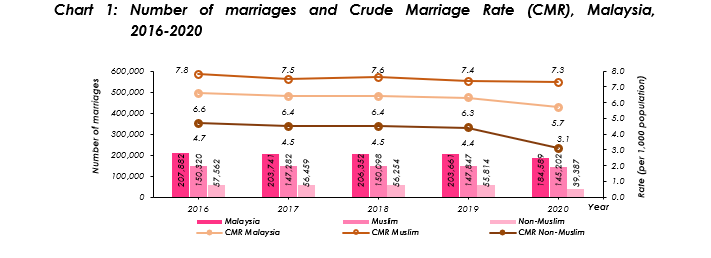 The number of marriages decreased 9.4 per cent from 203,661 (2019) to 184,589 (2020). Thus, CMR declined from 6.3 (2019) to 5.7 (2020) per thousand population. The number of marriages are affected by the coronavirus (COVID-19) pandemic and many couples have to put their wedding on hold following the Movement Control Order (MCO) implementation. During MCO, the solemnization is carried out via online and subject to permission from the National Registration Department and the State Islamic Religious Department.