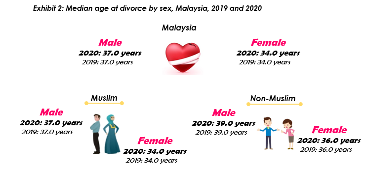 The median age at divorce for males and females remained at 37.0 and 34.0 years respectively. A similar pattern was also observed for Muslim and Non-Muslim divorcees.