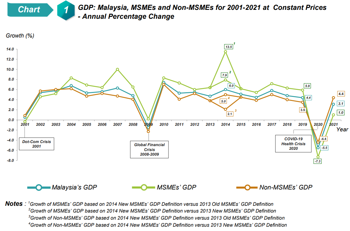 Malaysia’s MSMEs’ GDP in 2021 grew to 1.0 per cent (2020: -7.3%), which was slower than Malaysia’s GDP. The same trend was seen since 2020 according to the time series of Malaysia’s GDP and that of MSMEs as shown in Chart 1.