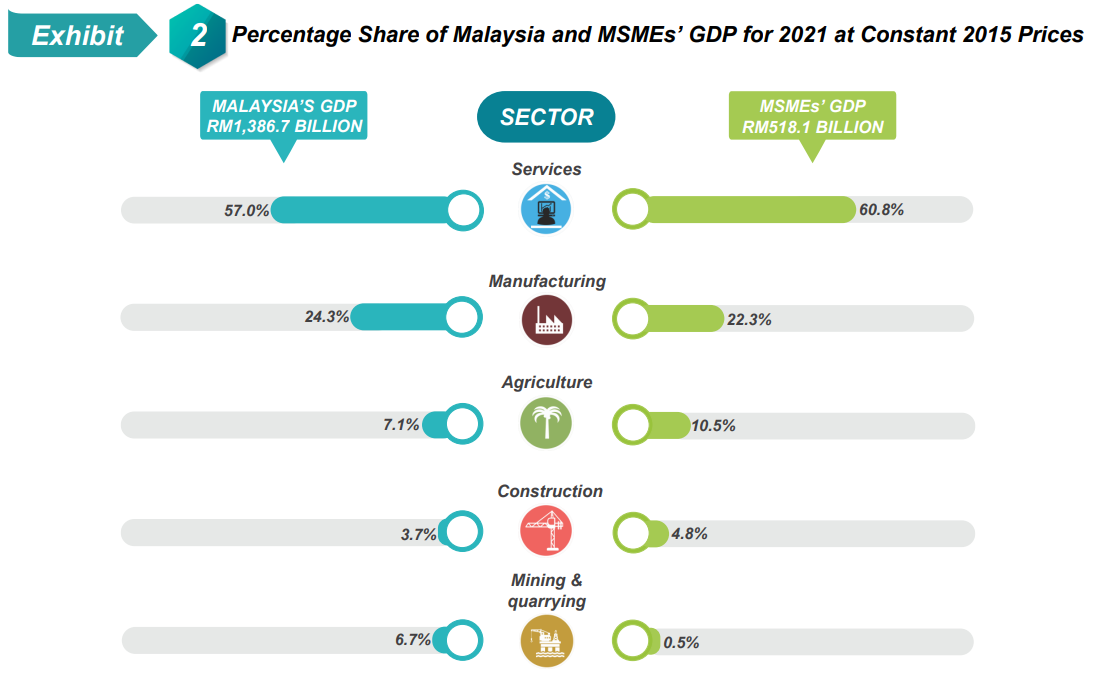 Malaysia’s economy regained its momentum in 2021, where the country has transitioned to Phase 4 of the National Recovery Plan (NRP) and inter-state travel restrictions were lifted. The gradual recovery will enable entrepreneurs to pick up business momentum, thus fueling Malaysia's economic recovery. Nevertheless, Malaysia’s economic performance in 2021 is still lower than pre-pandemic levels in 2019. Subsequently, the share of Micro, Small & Medium Enterprises (MSMEs) in terms of Gross Domestic Product (GDP), Exports, and Employment remained to decline in 2021.