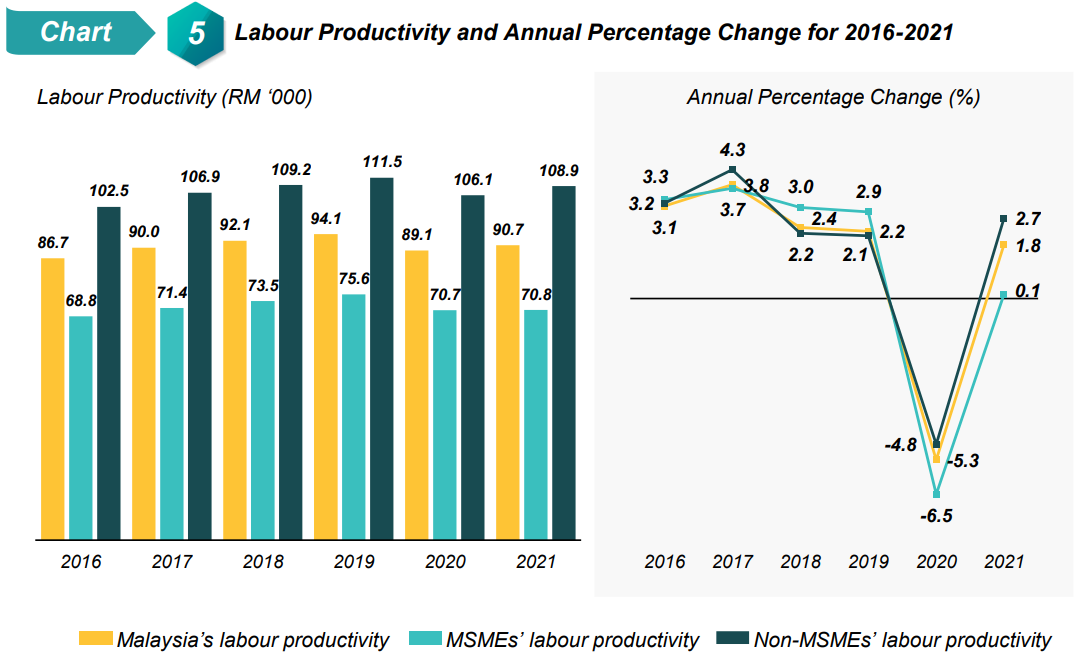 In addition, in comparison with Non-MSMEs, the MSMEs’ labour productivity growth was slower than Non-MSMEs which rebounded to 2.7 per cent from negative 4.8 per cent in 2020. The value added per employment for MSMEs also was consistently lower than Non-MSMEs’ labour productivity (RM108,921 per person) and national labour productivity (RM90,697 per person).
