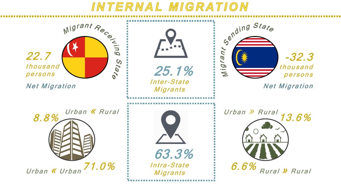 For inter-state movement, Selangor was the main receiving state of migrants while the main sending state of migrants was W.P. Kuala Lumpur. For intra-state movement, the majority of migrants at state level were also focused to urban areas within the same state for the period of 2014–2015.