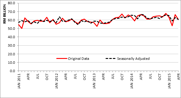 On a m-o-m basis seasonally adjusted terms, imports fell RM4.1 billion (-7.2%) to RM53.0 billion.