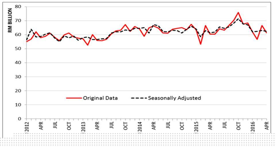 - On a m-o-m basis, imports was lower by RM3.1 billion (-5.6%) from RM55.4 billion. In seasonally adjusted terms, imports also decreased 2.4%.