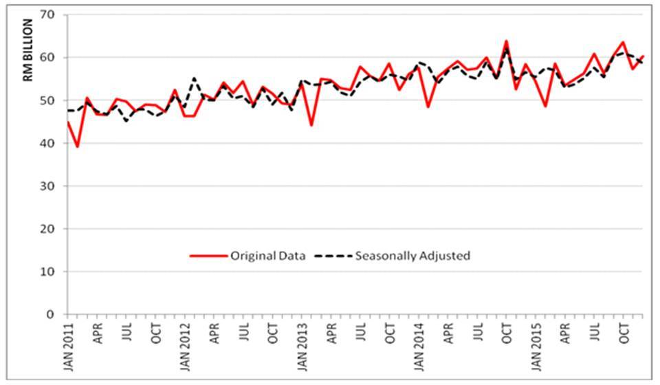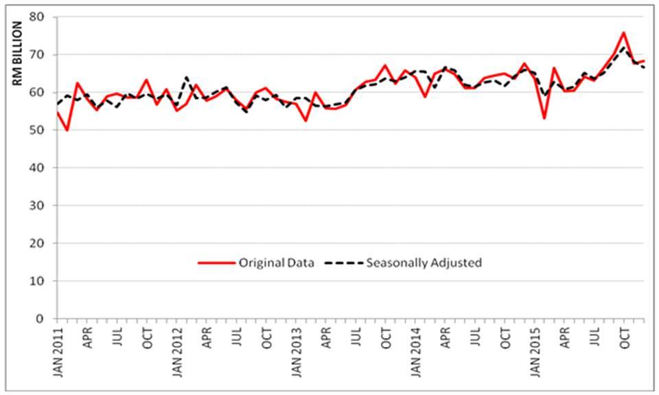 On a m-o-m basis seasonally adjusted terms, imports decreased RM1.7 billion (-2.9%) to RM58.6 billion.