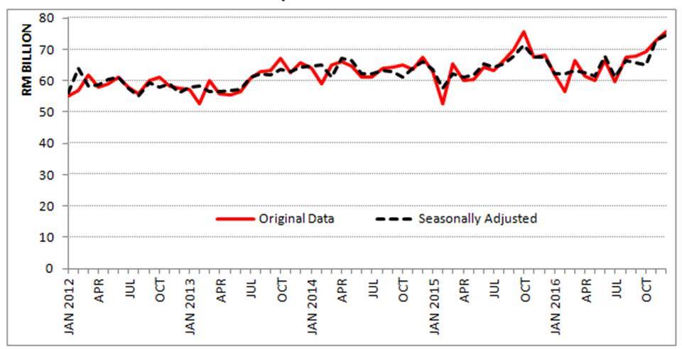 - On a year-on-year (y-o-y) basis, exports expanded RM7.3 billion (+10.7%) to RM75.6 billion. Re-exports in December 2016 was valued at RM11.4 billion and accounted for 15.1% of total exports.